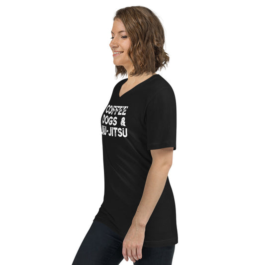 Camiseta Manga Corta Unisex con Cuello en V - Café, Perros y Jiujitsu